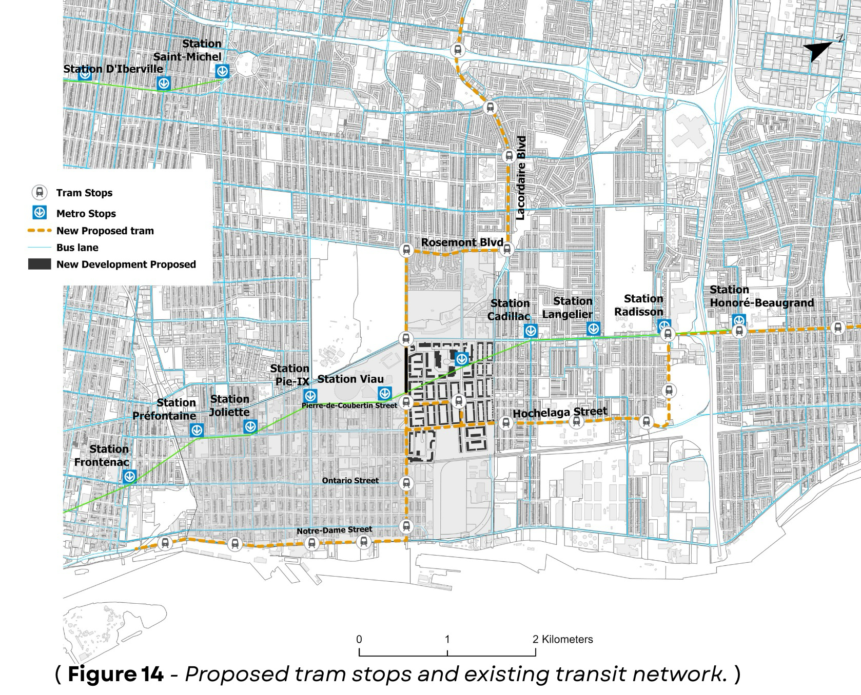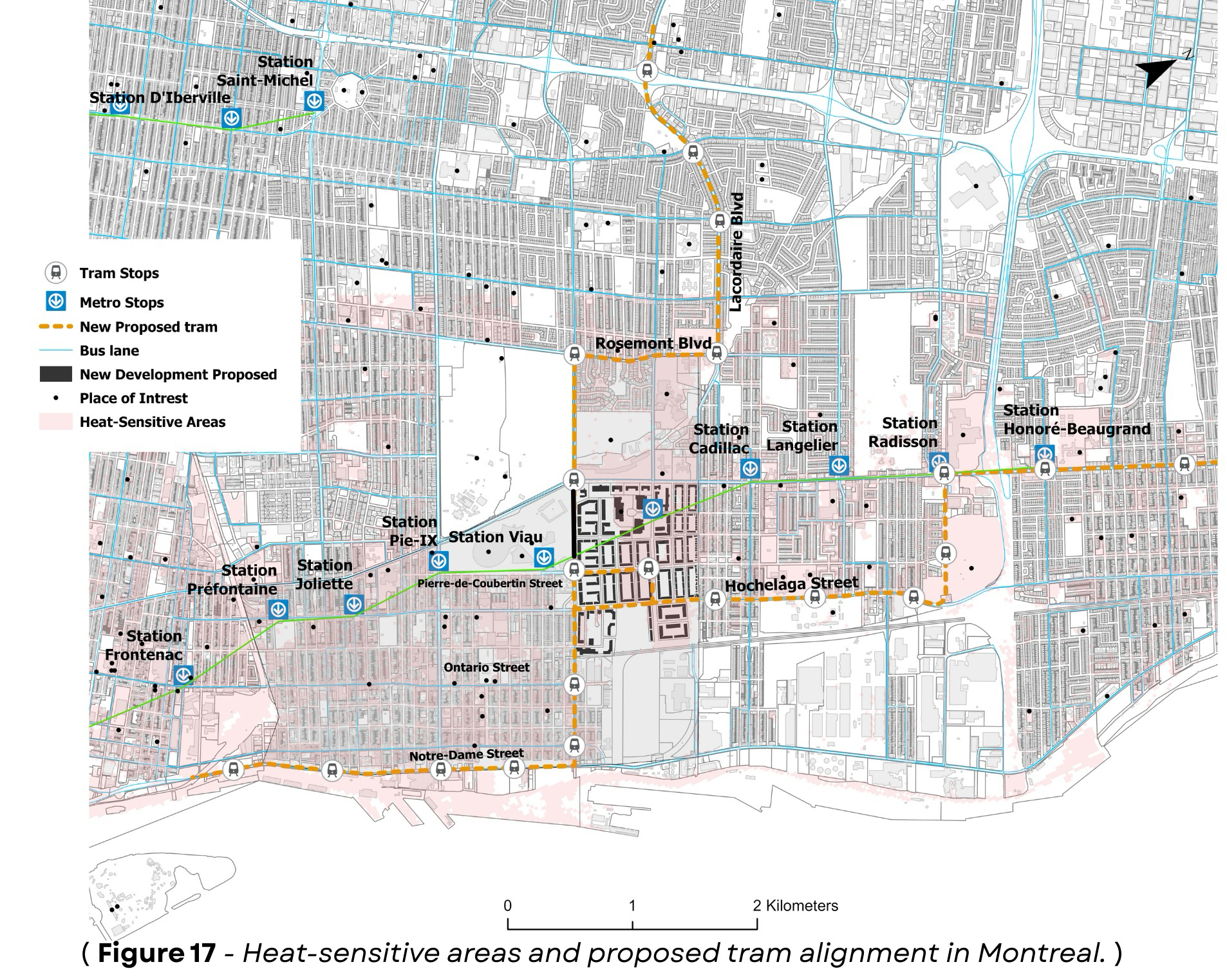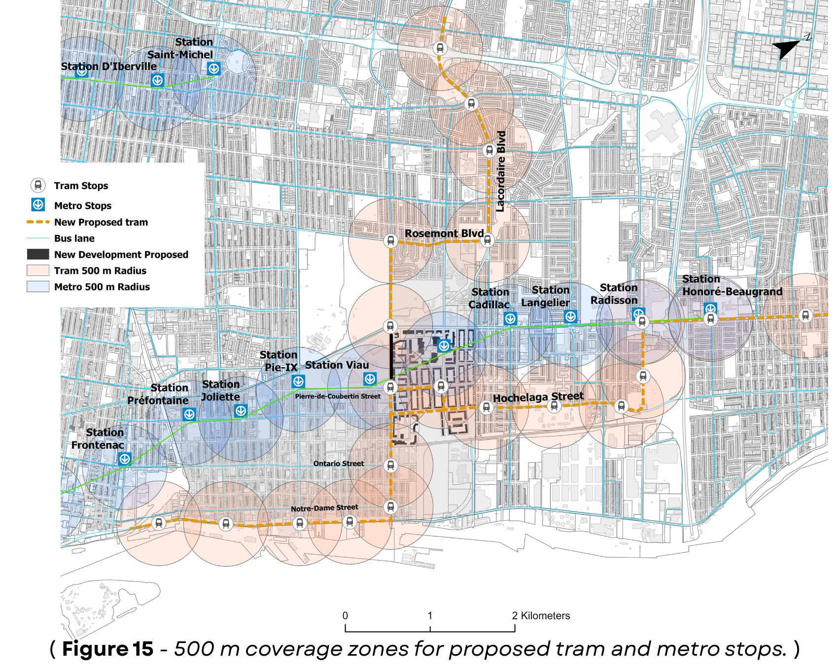 A 500-meter buffer analysis shows the tram extends access beyond the STM Green Line’s walking radius.