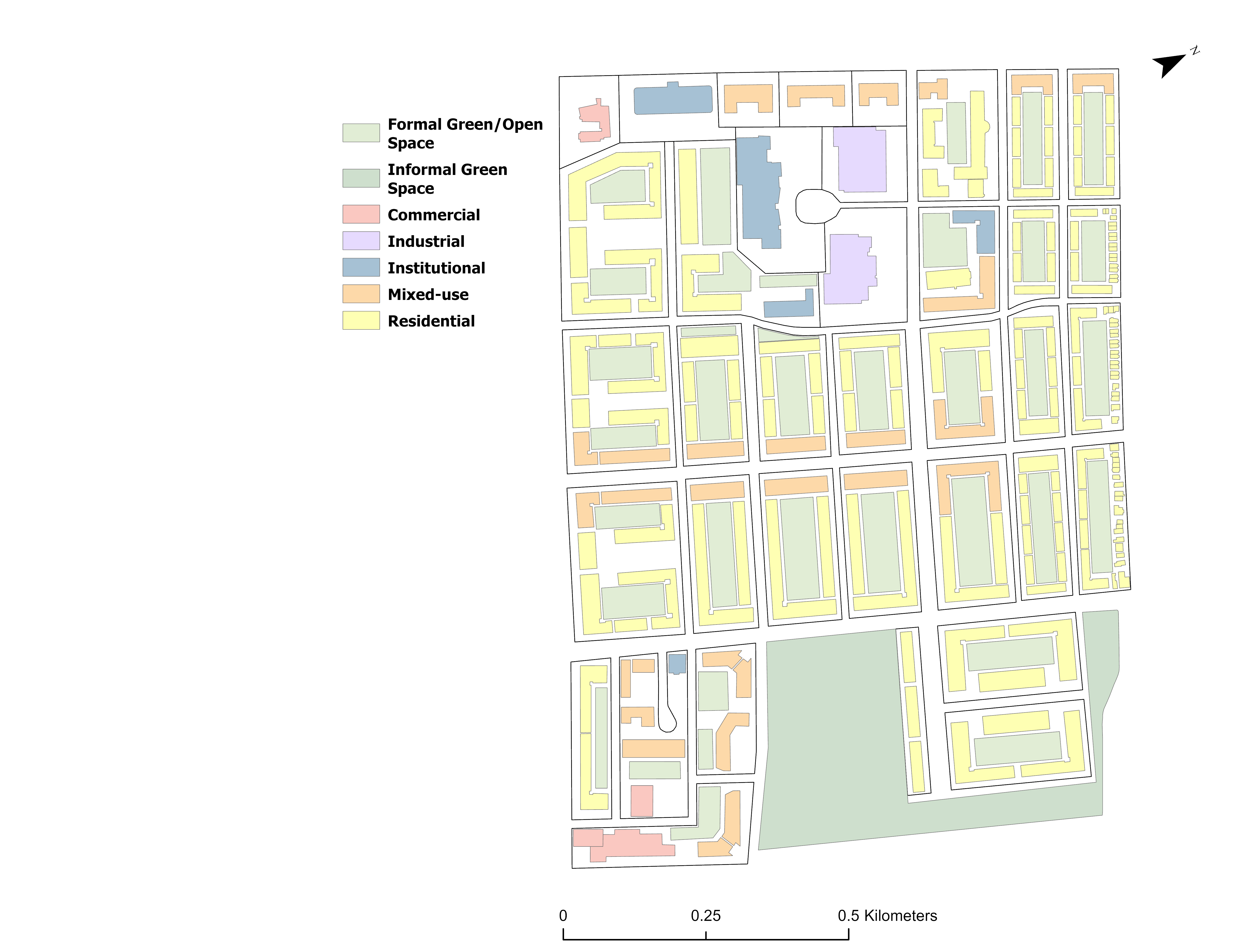 Residential use dominates, but key commercial and institutional areas enhance functionality.